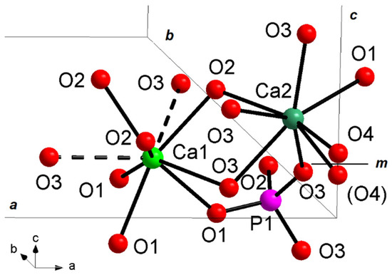 The Ca atoms display two different complex coordinations, i.e., Ca(1)O9 polyhedron, with three different pairs of bond distances related by site symmetry, and Ca(1)O6(OH), which can be described by an irregular pentagonal bipyramid characterized by five bonds (one Ca2-O1 and two different pairs of symmetry-related Ca2-O3 bonds) on the equatorial plane, and the two vertices occupied by O2 and the hydroxyl group (Figure 8). Ca-O bond distances are usually between 2.40 and 2.85 Å [50]; Ca-O distances over 2.8 Å, typical of Ca1 site, are considered out of the bonding sphere of calcium, displaying weak bonding character, as shown in bond valence parameters analysis (Table 4): for this reason Ca1 polyhedron is also indicated as Ca(1)O6 metaprism (polyhedron ideally intermediate between octahedron and trigonal prism), discarding Ca1-O3 distances as bonds and considering them as interactions.