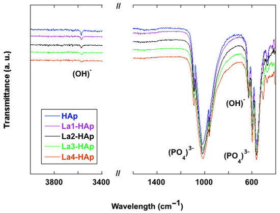 The FTIR spectra of La-doped HAp powders were registered in the 400–4000 cm−1 wavenumber region, and are depicted in Figure 10, compared with the spectrum of pure hydroxyapatite. Experimental band positions (wavenumbers, cm−1) are provided in Table 5.