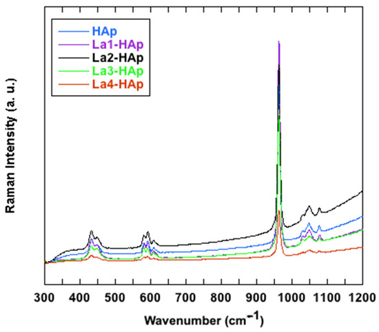 Raman spectra of La- and undoped-HAp, in 300–1200 cm−1 range.