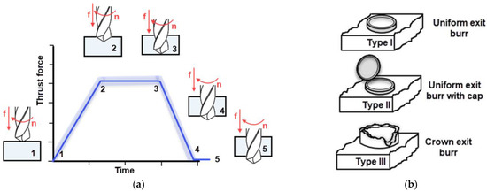 Minimizing or eliminating burrs at the hole exit of the drill is crucial for achieving high-quality hole mounting. Burr formation depends on various factors, including the properties of the workpiece material, micro-drill geometry and material, and cutting conditions [42]. Hashimur et al. [42] reported that burr formation increases with the ductility of the materials, and the geometry of the micro-drill also affects the sizes of burrs. Both the thickness and height of burrs decrease as the point and helix angles increase. Furthermore, increases in feed rate and cutting speed result in larger burrs [42]. While burr shapes can vary, there are three basic types: uniform, transient, and crown burrs (Figure 1b) [43,44]. Uniform burrs have a relatively small and consistent height and thickness around the periphery of the hole, and their formulation should ideally be minimal. These burrs form when the first fracture occurs at the center of the hole. In the case of transient burrs, the fracture occurs simultaneously at the center of the hole and around the exit. Crown burrs are larger in size and have an irregular shape around the exit hole [44,45].