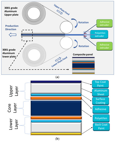 Composite materials have been extensively used in many advanced industrial applications such as spacecraft, automobiles, defense, building structures, sports, and electronics due to their lightness [1], corrosion [2], thermal resistance [3], high strength [4,5], and good fatigue life [6]. Composite materials comprise three main divisions in applications: particle-reinforced [7], fiber-reinforced [8], and structural laminates [9]. With this classification, composite materials of various properties have been developed for utilization in different fields. Al–PE falls within the category of structural laminated composites and comprises aluminum skin materials bonded to polyethylene (PE) through a rolling process. Al–PE was initially developed in 1965 by the German brand Aruqbang for decorative purposes. Since then, this material has gained widespread usage in fields such as building and construction, automotive, transportation, railway vehicles, and trailers [10]. This can be attributed to its desirable properties such as durability, strength, adaptability, superior corrosion resistance, lightness, and insulation. This laminated Al–PE composite also undergoes a drilling process for mounting applications. Numerous studies in the literature discuss the mechanical and machining characterization of such materials [11,12,13]. For instance, Gao et al. [14] reported that, when the bonding strength of the steel/Al/steel composite interface is low, delamination first occurs on the exterior of the bending, as seen in their study on the effect of bond strength on the formability of steel/aluminum composite panels. Additionally, Zitoune et al. [15] explained that drilling holes in composite stacks for assembly poses challenges for manufacturing engineers due to the varying machining properties of different materials. Sayer et al. [16] observed that the perforation threshold of hybrid composites impacted by the surface with carbon fiber was approximately 30% higher than that of the surface with glass fiber. In another study [17], it was shown that the thermoelastic performance of aerospace aluminum honeycomb panels allows the panel to cool down uniformly in all three dimensions. Ravishankar asserted that hybrid composites are emerging as an alternative to traditional composites in the global market, especially in automobile applications [18]. Yalçın and Ergene [19] noted that the critical factor for fiber-reinforced laminate composites is the formation of cracks at the interface between the matrix structure and the fibers that carry loads and distribute forces.