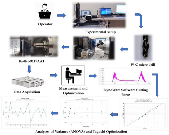 Researchers have shown growing interest in micro-manufacturing technology for fabricating miniaturized products made of composite materials in response to escalating industrial demand [20]. Micromachining methods, such as micro-milling [21,22,23], micro-drilling [24], micro-turning [25], micro-grinding [26], laser beam drilling, electrochemical drilling, and ultrasonic drilling [27], are frequently applied to composite materials [28]. The results of both conventional and micro-drilling operations depend on a variety of factors: cutting parameters such as feed rate, cutting speed, and coolant; tool parameters such as helix type, coating type, main angles, and effective edge length [29]; and workpiece material properties, including structure and stacking, strength, hardness, and porosity. However, materials with diverse properties in composite structures can cause cutting difficulties and poor manufacturing quality [30]. Consequently, researchers are striving to make significant progress in the micro-manufacturing of various metal-, ceramic-, polymer-, and composite-based components. Durao et al. [31] stated that composites are non-homogeneous, making drilling difficult due to issues such as delamination, pull-out, inter-laminar cracking, or thermal damage. Their study found that a low feed rate and a suitable tool point angle can help reduce thrust force and delamination. Another study highlighted that delamination problems, such as peeling of the upper layer and pushing out of the uncut layer, can occur due to thermal and cutting forces during the drilling of laminated composite. This phenomenon can lead to deterioration of long-term performance under fatigue loads [32]. Prasanna et al. [33] examined the effect of small-hole drilling on the quality characteristics of a carbon fiber-reinforced polymer composite (CFRP). It was found that the circularity error decreases with a low feed rate, and it was concluded that a higher spindle speed reduces the circularity error and taper. Furthermore, Khan studied the hole quality in CFRP drilling considering multiple performance characteristics, reporting that low torque results in defect-free and high-quality holes [34]. Kim et al. [35] reported that exit burrs of various sizes and shapes form when the drill approaches the bottom of the hole, and stress increases either along the edge or at the center of the hole exit due to tool advancement. Moreover, mechanical deburring of a micro-hole can be very challenging because it is hard to locate the hole, and a chemical deburring process is not suitable as it can distort the hole shape. Therefore, preventing exit burr formation is preferable in micro-drilling [35].