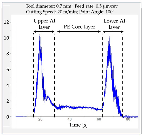 The micro-tool begins by cutting the upper Al layer of the laminated Al–PE composite, then enters the PE layer, and finally drills through the lower Al layer. This test produced interesting variations in thrust force that diverge from those observed in traditional materials. Figure 4 displays the thrust force variation over time for experiment number 2. As illustrated in Figure 4, when the cutting tool initially starts the cutting process, the force reaches its peak at 9.5 N. As the drill progresses into the PE core material, the thrust force drops sharply to 1.5 N. As the tool begins to drill through the lower Al layer, the thrust force increases once more, finally dropping to 0 N at the point where the drill exits.