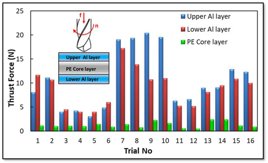 In Figure 5, the maximum thrust force values for the upper and lower layers and the PE core layer of the laminated composite are given. As can be observed in Figure 5, the maximum thrust forces in trials 7, 8, 9, and 10 are higher than those of other trials. A possible reason for the high thrust force in trials 7, 8, 9, and 10 is the small tip angle (100°). A similar situation is observed in experiments 1, 2, 15, and 16. Generally, a decrease in point angle correlates with an increase in thrust force. Therefore, to identify the influence of various drilling parameters such as point angle, tool diameter, coating, cutting speed, and feed on the micro-milling of the Al–PE laminated composite, the main effects plot for thrust force was generated through variance analyses. The results are displayed in Figure 6, Figure 7 and Figure 8.