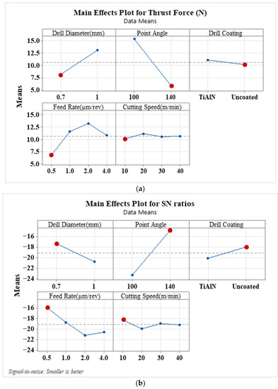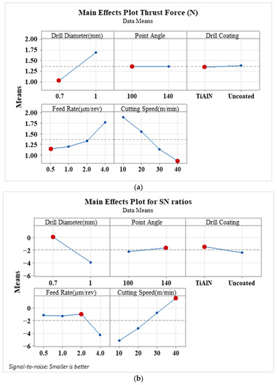 (a) Main effects plot and (b) SN ratio plot of the drilling parameters on the thrust force in the drilling of the upper layer of the composite when the drill enters.