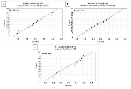 According to Table 4, the point angle has the most significant effect at 64.54%, while the feed rate follows with a 15.93% contribution when the drill penetrates the composite. In addition, the contributions of cutting speed and coating to thrust force are 0.4% and 0.6%, respectively. Conversely, as the drill progresses into the PE core layer, the contributions of cutting speed and coating to thrust force are 45.32% and 17.71%, respectively, representing the most substantial and second-most significant effects, as shown in Table 5. The point angle has no contribution, and the coating contributes 0.09% to the thrust force. As indicated in Table 6, when the drill approaches the hole exit, the point angle accounts for 68.95%, the coating for 11.85%, the feed rate for 8.23%, and the cutting speed for 1.69% of the thrust force. The increase in drill diameter has an important effect on thrust force during drilling of the PE core layer. The probability plots for the thrust force of each layer are presented in Figure 9. Figure 9a shows that the normal probability percent for drilling the upper layer is 99.14%, whereas it is 97.8% for the lower layer, as shown in Figure 9b. Additionally, it is 95.04% for the PE core layer, as depicted in Figure 9c. These results confirm the critical importance of individual factors, such as point angle, feed rate, and cutting speed, at different stages of the drilling process. The dynamic interplay of drilling parameters as the drill transitions through layers of diverse material properties illustrates the complexity of such operations. It is also noteworthy that the impact of drill diameter increases significantly while drilling through the polymer layer, suggesting the need for careful selection and adjustment of this parameter to optimize force control [55].