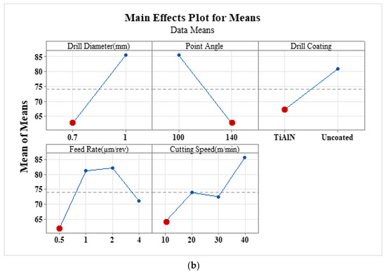 Figure 6 presents the main effects plot and SN ratios of drilling parameters on thrust force on the upper layer of the composite where the drill enters. According to Figure 6a, the tool point angle has the most important effect on the thrust force occurring in the upper layer of the composite during drill penetration. When the point angle increases from 100° to 140o, the thrust forces decrease. This is because a decrease in the point angle leads to an increase in chip thickness, which, in turn, increases the thrust force [52]. The tool diameter also significantly influences the thrust force; when the tool diameter changes from 0.7 mm to 1 mm, the thrust forces increase. Another study corroborated these findings, demonstrating that thrust force increases with an increased tool diameter [15]. The feed rate has a significant impact on thrust forces between 0.5 µm/rev and 2 µm/rev, but thrust forces slightly decrease with a feed rate of 4 µm/rev. Another study found that feed rate most significantly affects the main cutting force and surface roughness [53]. The use of an uncoated drill slightly reduces thrust force. A similar effect was observed for cutting speed. It can be concluded that a narrow point or tip angle and a feed rate of 0.5–1 µm/rev are preferable for stable shearing and reducing thrust force. The SN ratio plots shown in Figure 6b suggest that the lowest thrust force can be achieved from micro-drilling with an uncoated 140° point angle, a feed rate of 0.5 µm/rev, a cutting speed of 10 m/min, and a 0.7 mm drill diameter.