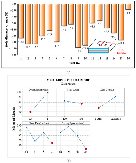 (a) Micro-tool diameter change (%) in 16 trials. (b) Main effects of drilling variables on the change in tool diameter.