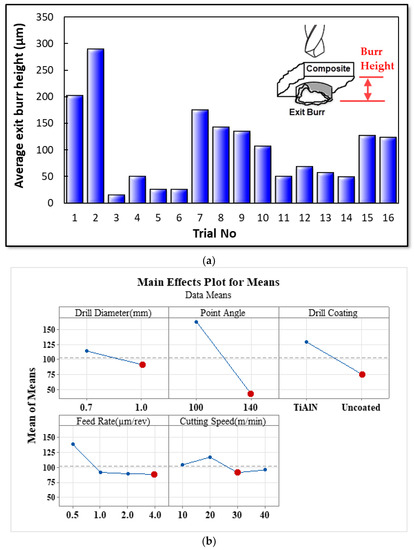 (a) Burr height at the hole exit for all tests. (b) Main effects of drilling variables on the burr height.