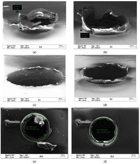 A study [56] investigated the effect of cutting parameters on the hole diameter deviation. Unlike that study, the present investigation did not involve fiber composite, and therefore, the peel-up at the hole entrance did not occur. Consequently, hole diameter deviation was assessed by SEM measurements. In this study, Dh represents the hole diameters, and D corresponds to the drill diameters. The change in hole diameter was calculated using a basic deviation rate (Dh/Dort), and variance analyses were performed based on these measurements (Figure 11). As illustrated in Table 8, among drilling parameters, cutting speed had the most significant (25.15%) effect on hole diameter change. Furthermore, an increase in cutting speed and feed rate led to a decrease in hole diameter change. As drilling in a shorter time is allowed by increasing the cutting speed and feed rate, the change in hole diameter is minimized. As can also be seen from Table 8, the impact of the point angle on hole diameter deviation is minimal. Utilizing a coated tool resulted in a decrease in hole diameter variation, and an increase in drill diameter led to a rise in the amount of hole diameter deviation. A study [57] observed an increase in hole diameter deviation with an increase in tool diameter. In the same study, minimal hole diameter change was reported with the increase in feed rate and cutting speed. From this perspective, it can be said that the findings obtained from drilling Al–PE material under micro-conditions are consistent with the existing literature.
