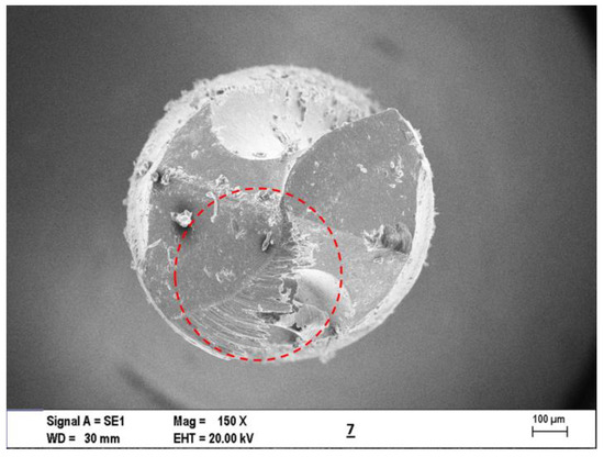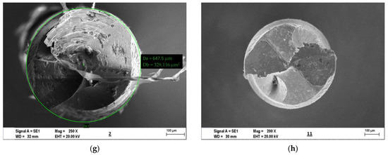 In Figure 13, the SEM screens selected from among all results were given. Figure 13a,b presents the highest average burr height measured from five specimens in the second micro-drilling test. As can be seen, the hole exit is quite a bur and not clean. Therefore, there is a need for de-burring after micro-drilling laminate composite. Figure 13c shows the lowest average burr formation at the hole exit with the third micro-drilling condition. This sample hole exit is the cleanest and has almost no de-burring process. Figure 13d indicates that this is the hole where the highest thrust force occurred. Figure 13e shows a sample of the hole diameter measurement applied to all drilled holes. All average hole diameters were measured in five different holes. Another hole diameter is lower than the drill diameter, depending on the decrease in tool diameter with wear. This state was shown as an example in Figure 13f. In the second experimental condition, the burr occurred at its maximum, and chip adhesion was observed to the micro-drill. On the other hand, chip adhesion concentration has been seen in the core diameter and nose area of the micro-tool in drilling with the ninth condition, which is given in Figure 13g. This phoneme increases the thrust force by preventing the progress of the drill in the composite structure. Similarly, an extremely high chip adhesion (red dotted circle in Figure 14) on the major cutting edge and nose area was observed in the seventh condition, which is one of the experiments in which the thrust force maximum was given in Figure 14.