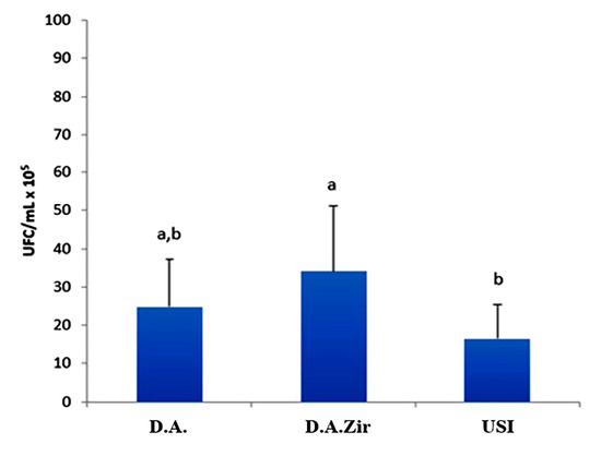 Figure 2. Comparative graph between D.A., D.A.Zir, and Universal Scanning Interferometry (USI) groups considering the average of CFU/mL × 105, according to ANOVA and Tukey tests (p < 0.05; different lowercase letters indicate the statistical difference).