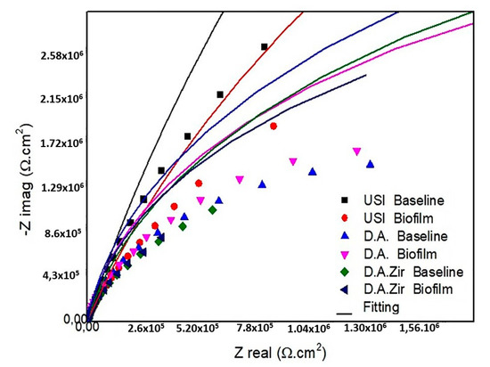 For the Nyquist diagram, which is intended to provide greater resistance to charge transfer and lesser potential for ionic exchanges with the external environment, the larger semi-circular diameter of the USI (BHI) and USI (Biofilm) denotes good electrochemical behavior. This is also observed for the D.A. (Biofilm), but without major differences from the other D.A.Zir (BHI and Biofilm) and D.A. (BHI) groups. If there are fewer surface irregularities or pores, there may be lesser ionic exchanges with the medium [56,57]. Ti surfaces exposed to changes in the pH of the low oral environment, as is observed with the use of fluoridated toothpastes that promote acidification of the medium with damage to the TiO2 layer, become vulnerable to corrosion [58,59,60].