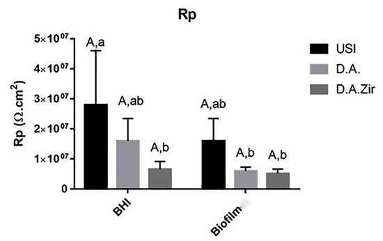 Figure 4. Graphical representation of the means and standard deviations of the Rp values for the USI, D.A. and D.A.Zir groups in Biofilm and BHI. Equal capital letters show statistical similarity between the surfaces. Equal lowercase letters show statistical similarity with respect to the electrolytes (BHI and Biofilm) between the groups.