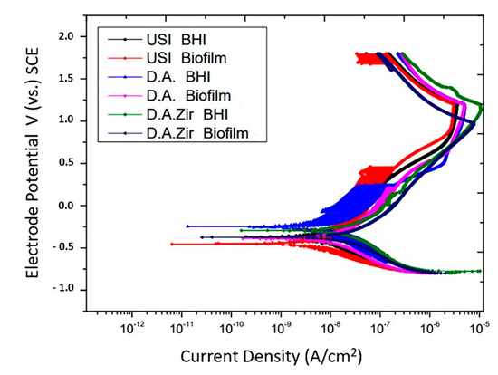 The parameters to which the groups were submitted correspond to the OCP, EIS, and the potentiodynamic polarization curve. The electrochemical corrosion reactions on the surface of the specimens used in this study required a humid or electrochemical environment, which is free from mechanical corrosion where functional stresses on the implant could compromise it [54,55]. For OCP, the D.A.Zir (Biofilm) groups exhibited the best behavior for recovering the electrical potential in lesser time. Groups D.A. (BHI) and D.A.Zir (BHI) showed good stabilization of the system, at the beginning, to resist corrosion as well. OCP showed no statistical difference for the surface (p = 0.9891) and electrolyte (p = 0.3681), and this analysis indicates that the presence of the biofilm on the specimens influenced the electrochemical stabilization by causing the biofilm to protect against corrosive events. It should be noted that the OCP makes it possible to assess the potential of the material before the solution and stabilize the system.