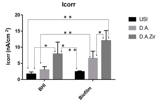 Figure 6. Graphical representation of the means and standard deviations of the Icorr values for the groups of surfaces (USI, D.A. and D.A.Zir as a function of electrolytes (BHI and Biofilm)). A single asterisk on the indication of the specimens corresponds to the electrolyte factor. Asterisks over the specimen indication correspond to the surface factor.