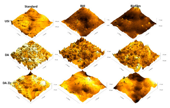 In general, it is observed that the USI surface is more homogeneous than the others (D.A. and D.A.Zir)—regardless of the biofilm and electrochemical assay. However, it is observed that there is a greater difference in altitude from a surface of 0.65 µm to another of 1.7 µm after the corrosion testing in the presence of E. faecalis. However, the surface treated with D.A. has well-defined peaks and valleys, albeit with a decrease in the specimen’s altitude after the corrosion test and by contact with the biofilm (from 3.1 µm to 2.1 µm). This is due to deposition of organic and biological materials on the surface, making it less irregular and attenuating the altitude of peaks and valleys.