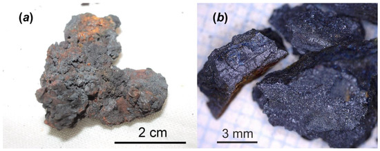 One of the highly radioactive samples consisted of molten and oxidized steel and corium. It was collected by V.A. Zirlin and L.D. Nikolaeva in room 305/2 (right below former reactor core) of the Chernobyl “Shelter” in 1990: general view (a); and small broken fragments prepared for alteration test (b).