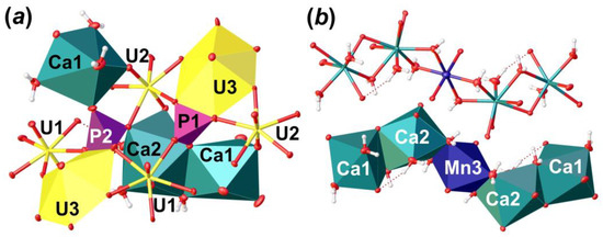 There are two non-equivalent Ca2+ sites, one Mn2+ site and six H2O molecules arranged in between the uranyl phosphate layers (Figure 5c). Ca1 site is surrounded by three H2O molecules and two OUr atoms, and two O atoms are shared with two distinct phosphate groups with <Ca1–O> = 2.424 Å. Ca2 site is surrounded by four H2O molecules, two OUr atoms, and two O atoms are shared with two distinct phosphate groups with <Ca1–O> = 2.498 Å. Ca1 and Ca2 coordination polyhedra share common O13···H2O20 edge to form dimer. The Mn3 site occupies an inversion center, which is arranged between two neighbor dimers of Ca-centered polyhedra. This site represents a rather classical octahedron surrounded by four H2O molecules (Mn3–H2O = 2.207 (3)–2.266 (4) Å) in the equatorial plane and another two apical OUr atoms with slightly elongated bonds (Mn3–OUr12 = 2.387 (3) Å), which can fit any of divalent cations. In the case of Phu crystal, an electron density peak of c.a. 1.1 e/Å3 was arranged in this site. Chemical analyses showed the presence of Mn in the examined samples, the amount of which corresponds to the site occupancy revealed in a course of SCXRD studies. Moreover, the presence of a cation at the Mn3 site results in a formation of the Ca1-Ca2-Mn3-Ca2-Ca1 pentamers via sharing common edges between Ca- and Mn-centered coordination polyhedra (Figure 6b). Pentamers are stretched along c.a. [102] and [-102] and separated by an additional H2O23 molecule, which links uranyl phosphate layers and pentamers only through H-bonds.