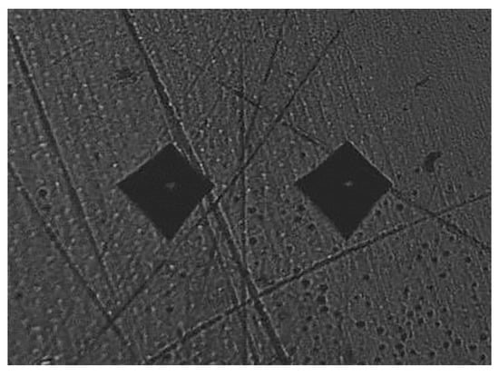 Representative surface microhardness testing image showing two diamond shaped indentations situated 1 mm or more apart over the tested dentin surface.