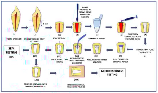 This study was initiated after obtaining ethical approval from the university’s Ethics and Research Committee. Fifty human permanent single rooted and single canaled teeth extracted due to carious, periodontic or orthodontic reasons were procured from the Institution’s oral health centre according to the Ministry of Health Guidelines for Ethical Review of Clinical Research or Research Involving Human Subjects (2006). The sample size was calculated based on mean and standard deviation using G*Power 3.1.9.2. (Heinrich Heine University, Dusseldorf, Germany; Erdfelder, Faul, & Buchner, 1996), giving the power of study as 95.34% with a total sample size of 50 (10 per group). The level of significance was set at 0.05. The procured extracted teeth were cleaned, sterilized and stored in distilled water until used. All teeth were decoronated and sectioned apically using a diamond disc (NTI Flex, Kerr Dental, Brea, CA, USA) under continuous water spray to prepare the middle third of root sections of 5 mm length. The canals of the root sections were prepared with Gates-Glidden burs (Dentsply Maillefer, Ballaigues, Switzerland) from size 2 (0.70 mm) to size 6 (1.50 mm) in a step-back manner and irrigated with distilled water. The prepared root canals were irrigated with 5 mL of 3.0% NaOCl (Parcan N, Septodont, Saint-Maur-des-Fossés, France) and 17% EDTA (Largal Ultra, Septodont, Kuala Lampur, Malaysia) to remove the smear layer, followed by a final rinsing with distilled water. Apical ends of the root sections were sealed using cold cure acrylic resin (Vertex Self Curing, Sdn Bhd, Kuala Lampur, Malaysia), mimicking as an apical barrier to prevent extrusion of the OrthoMTA. OrthoMTA powder (BioMTA, Seoul, Republic of Korea) was mixed with distilled water (powder to liquid ratio of 3:1) into a paste consistency according to the manufacturer’s instructions and packed into the root sections using an OrthoMTA gun and OrthoMTA plugger (BioMTA, Seoul, Republic of Korea) with a 1.0 mm sized tip and butt end of a size F3 Protaper Gold absorbent point (Dentsply-Sirona, Charlotte NC, USA) using minimal pressure. The filled root sections were covered with a damped gauze soaked in phosphate-buffered saline and stored in an incubator with 100% humidity at 37 °C for one week to allow the complete setting of the OrthoMTA.
