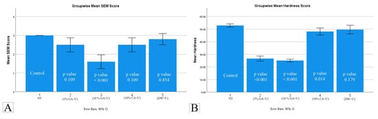 Histogram depicting groupwise mean values along with standard deviation, shown as error bars. (A) Residual OrthoMTA score. (B) Surface microhardness score.