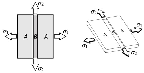 The M-K theory considers the thickness of the sheet metal to be inhomogeneous and that this inhomogeneity is amplified during stretching until fracture. The theory uses a model of a sheet with a groove to carry out the study of a sheet subjected to biaxial stretching. Where zone A is the uniform deformation zone, zone B is the groove zone, and , are the maximum and minimum principal stresses in Figure 1.