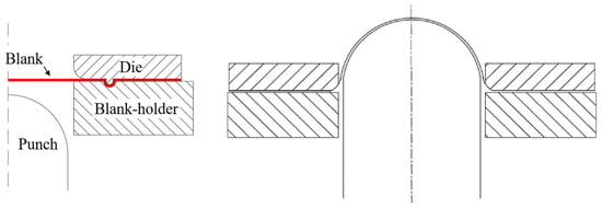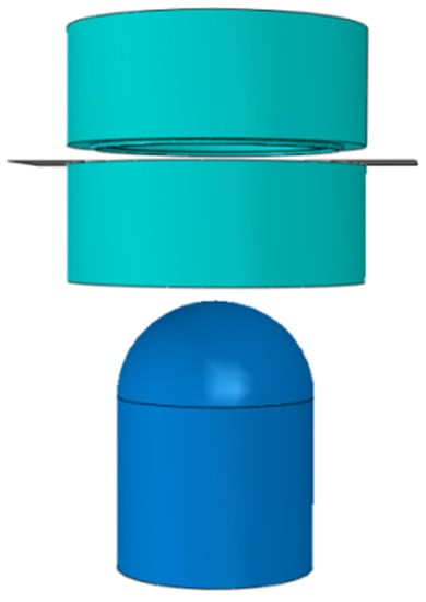 Plotting FLD requires obtaining the maximum and minimum principal strain data of the sheet, which can be obtained by Nakazima dome tests on specimens of different sizes [18]. In this paper, experiments are designed with reference to GB/T 15825.8-2008, Sheet metal formability and test methods—Part 8: Guidelines for the determination of forming-limit diagrams. The Nakazima test in this paper was carried out using a YZ32-160S hydraulic press by Zibo Aoheng Hydraulic Machinery Co. (Zibo, China). The Stamping test machine is mainly composed of blank, punch, die and blank holder. The structural principle is shown in Figure 3. During the Nakazima dome test, the blank holder moves downwards to provide sufficient pressure to secure the sheet, and then the punch moves upwards to cause deformation of the sheet until the sheet fractures.