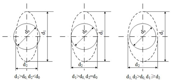 Before the Nakazima test, in order to measure the strain of specimens, an electronic marking machine was used to etch an array composed of 1 mm circular grids on each specimen through electrochemical methods (Figure 5). The maximum and minimum principal strains were calculated from the deformation variables of the grid before and after the test. Assume that the circular grid is elliptical after distortion, and the maximum axis is recorded as d1 and the minimum axis as d2, and the d1 and d2 are approximately regarded as two principal strain directions on a point in the surface of the specimen sheet. The diagram of grid circle distortion is shown in Figure 6. After the test, the process stress and strain data and the real stress and strain data are calculated according to Equations (16) and (17).