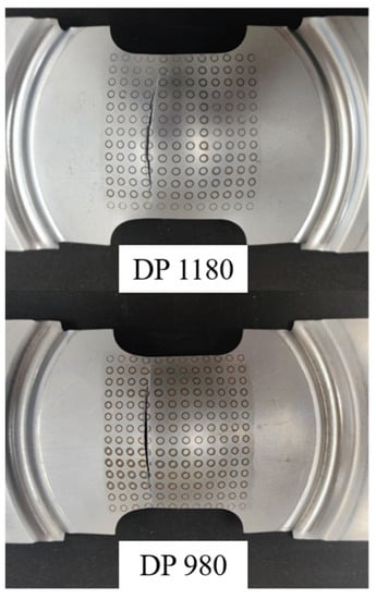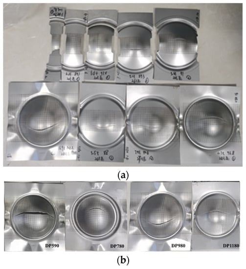 Specimens after the Nakazima test are shown in Figure 7. By observing the fracture specimens in Figure 7, it is found that the places where the fracture surfaces of specimens of different sizes occur are roughly the same. As the tensile and yield strengths of the steel increase, greater blank holder force is required to compress the sheets. The blank holder force increases from about 100 kN for DP590 to about 300 kN for DP1180, while reducing the forming depth and causing earlier failure. Therefore, steel sheet with high tensile strength and yield strength is difficult to be stamped and forming. The fracture surfaces of specimens of most sizes produce arc fracture tracks near the center of the specimen.