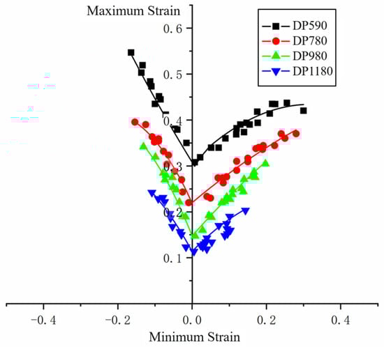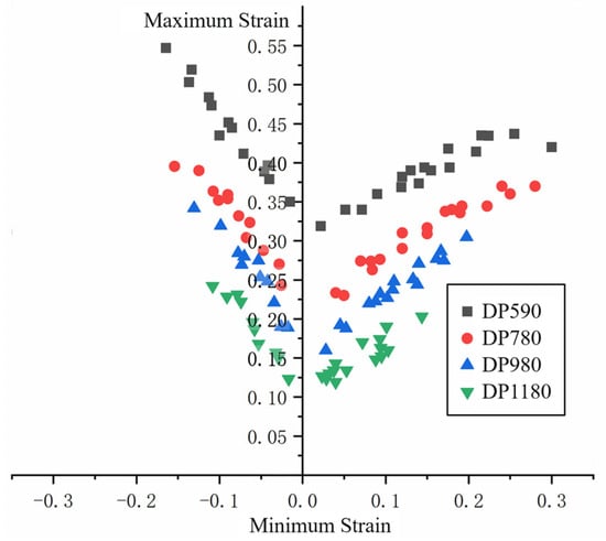 The grid distortion of failure critical area is measured and the data are processed to obtain the maximum and minimum principal strains of each grid. Limit strain data after processing is shown in Figure 8. It is found from the limit strain data of nakazima test that the value of the limit principal strain of sheet forming increases with the increase of the sheet strength, and the value range of the minimum principal strain also expands with the increase of the sheet strength. The trend of the FLC on the left and right sides of the four DP steel is the same, showing a decreasing trend in the left branch as a whole, and an increasing trend in the right branch.