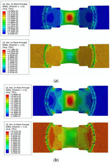The bulge fracture simulation was carried out for DP590, DP780, DP980 and DP1180 respectively, and the strain nephograms at the fracture time were obtained. The simulated strain nephograms of some sheets are shown in Figure 11. At the same time, the maximum and minimum limit principal strain data of the bulge specimens of different sizes are recorded and sorted out.