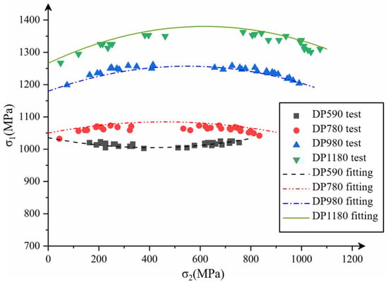 The limit stress data of DP590, DP780, DP980 and DP1180 are determined by combining the conversion function with the performance parameters of the four kinds of sheets. To fit the FLSD formula, the FLSD fitting curves of DP590, DP780, DP980 and DP1180 are established, and the limit stress data points are processed. Observe the curves in the Figure 13, the trend is relatively gentle compared with FLD. The limit principal stress ranking between each type of DP steel is consistent with the strength ranking of the steel. The curves are obtained by multiple linear regression fitting in combination with the performance parameters of the sheets, the coefficient of the quadratic term of curves is related to the hardening exponent n. as shown in Equation (22). The expression established after fitting is as follows: