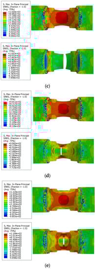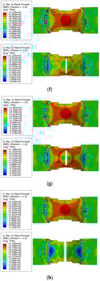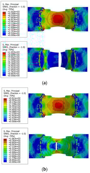 Principal stress distribution at the moment of fracture (a) DP590; (b) DP780; (c) DP980; (d) DP1180.