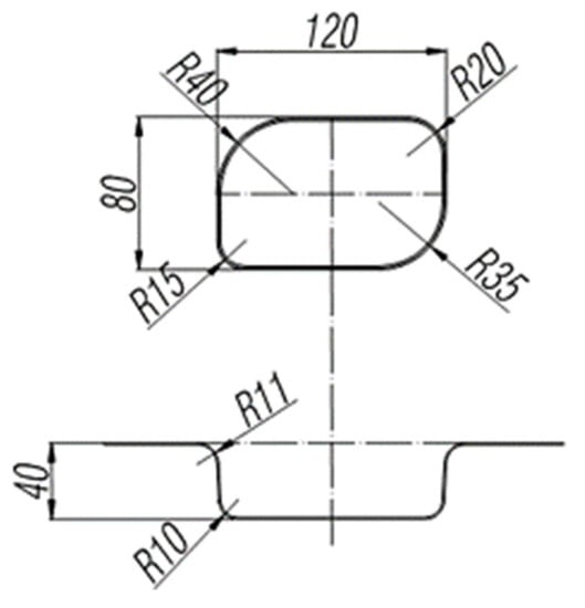 In order to verify the fitted forming limit curve, the box forming test was carried out by YZ32-160S hydraulic press. The test equipment was roughly the same as the bulging tests. Punch and blank holder are replaced with box die. In order to study the effect of different fillet on the forming effect, a box die with four sizes of fillet was experimentally designed. The size of box die with unequal fillet is shown in Figure 16. The rectangular sheet of DP590, DP780, DP980, and DP1180 were tested by the press with the size of 190 mm in length and 180 mm in width. A simulation model was designed based on the mold size the simulation model is shown in Figure 17. Simulating the forming process of the box forming experiment, and the limit stress value is obtained. FLSD damage data is imported into Abaqus, and the accuracy of FLSD data of each sheet is verified by outputting the maximum principal stress through damage evolution settings.