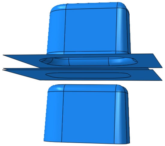 Establishing contact and friction on the surfaces of the rigids and the deformable shell, and the friction coefficient of the whole model is set to 0.15. Limit all degrees of freedom of the die during the simulation. The first step compresses the blank downwards with the blank holder, and the second step deforms the blank with the punch upwards. The finite element model of the Nakazima test is illustrated in Figure 10.