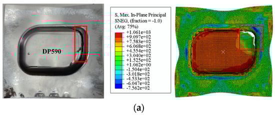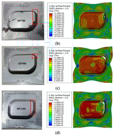 The test and simulation results of the box forming and the simulated principal stress values are shown in Figure 18. By observing the FLSD simulation results of the four types of sheet DP590, DP780, DP980 and DP1180, and comparing maximum and minimum principal stress values obtained from the stamping forming test and simulation of each type of sheet box, it is found that the maximum principal stress gap of the four types of sheet is large and the minimum principal stress gap is small. Maximum principal stress of DP590 is kept around 1000 MPa; the maximum principal stress simulation value of DP780 is about 1100 MPa; the maximum principal stress of DP980 fluctuates around at 1200 MPa; the maximum principal stress of DP1180 reaches 1300 MPa. The maximum principal stress and the minimum principal stress values of the four kinds of DP steel sheet show an increasing trend, but the growth range of the minimum principal stress is small with the increase of the sheet strength. The comparison of box forming test and simulated stamping depth is shown in the Table 8.