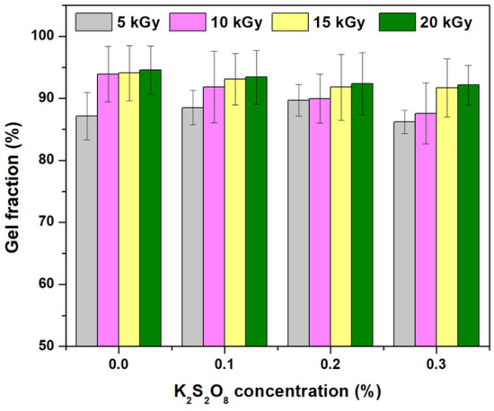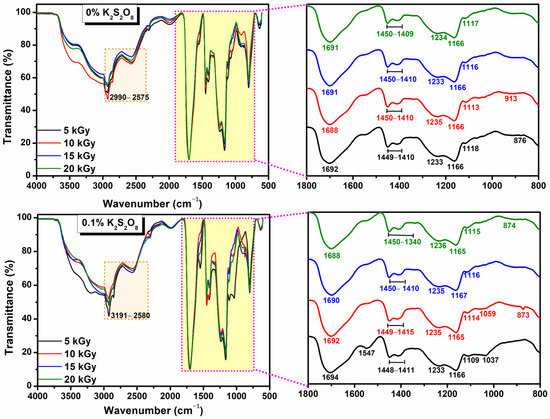 Figure 9 shows the FTIR spectra of hydrogels containing different concentrations of K2S2O8, prepared by electron beam irradiation at doses of 5–20 kGy.