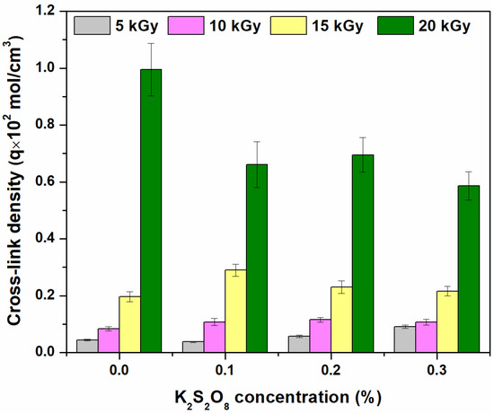 As can be seen from Figure 1, the increase in irradiation dose has led to an increase in the hydrogel gel fraction from 87.1% to 94.6% without PP. Contrary to expectations, adding PP as an initiator has led to a gel fraction decrease that is lower at 20 kGy than those obtained without it: i.e., 93.4%, 92.4%, and 92.1% for 0.1%, 0.2%, and 0.3% PP, respectively. Both the gel fraction and cross-link density (Figure 2) are strongly influenced by the irradiation dose and the initiator concentration. As can be seen from Figure 2, the “hyper cross-linking” effect is more pronounced in the case of e-beam irradiation [38] and is usually associated with the mesh size decreasing. This behavior has also been observed at the transition from 15 to 20 kGy.