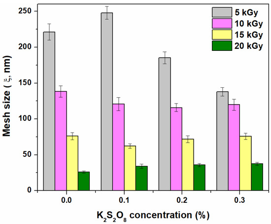 All investigated hydrogels have shown gel fractions over 87.0%, regardless of the irradiation dose. Hydrogels with a high gel fraction (>87.0%) can be obtained even at the lowest irradiation dose of 5 kGy, showing that grafting and cross-linking reactions take place even at low irradiation doses. Even if high values of gel fraction and cross-link density have been obtained in the absence of PP, the mesh size has decreased (Figure 3) and, as a consequence, the water absorption degree is expected to be affected. Furthermore, at low irradiation doses and in the absence of an initiator, brittle hydrogels at maximum swelling were obtained. The concentration of 0.1% PP has led to the obtaining of hydrogels with a gel fraction over >87.0%, as in the case of samples without PP, but more stable in the swollen state. Increasing the PP concentration to 0.2 and 0.3%, respectively, led to stable hydrogels with smaller mesh sizes. From Table 1, it is observed that the molecular weight between two successive cross-linking points (Mc) decreased with increasing irradiation dose, regardless of the presence or absence of PP. For this reason, the variations due to the addition of PP are almost irrelevant.