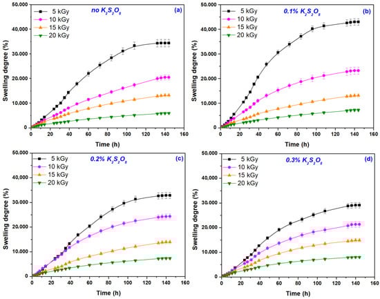 The swelling degree of hydrogels in distilled water depending on the irradiation doses and initiator concentration (a) 0%; (b) 0.1%; (c) 0.2% and (d) 0.3%.