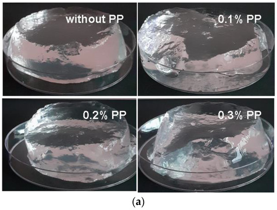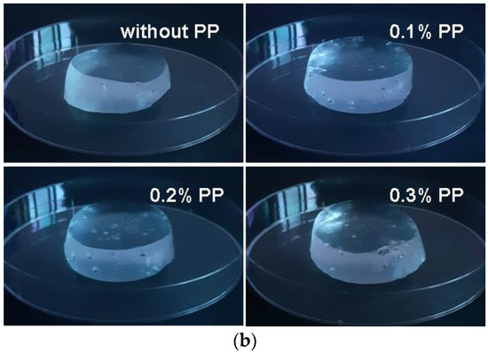 Images of hydrogels in the swollen state with and without PP and obtained at (a) 5 kGy, respectively (b) 20 kGy.