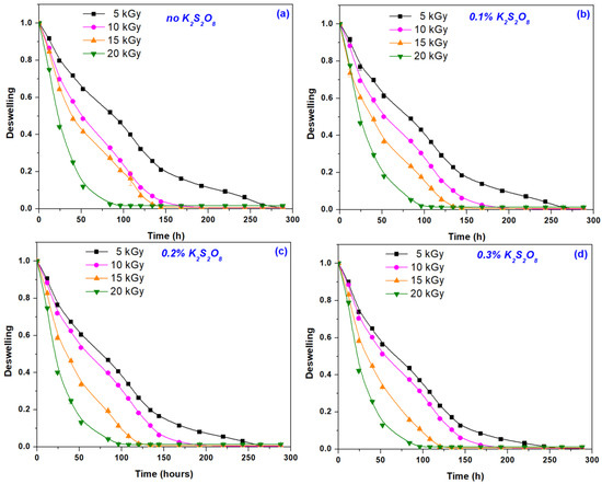 Deswelling degree in time of hydrogels immersed in distilled water depending on the irradiation doses and initiator concentration (a) 0%; (b) 0.1%; (c) 0.2% and (d) 0.3%.