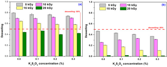 Deswelling degree of hydrogels immersed in distilled water depending on the irradiation doses and initiator concentration at (a) 24 h and (b) 96 h.