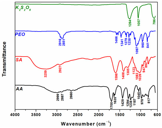 The ATR-FTIR spectra of pure SA, pure PEO, pure AA, and PP in the transmittance mode are presented in Figure 8.