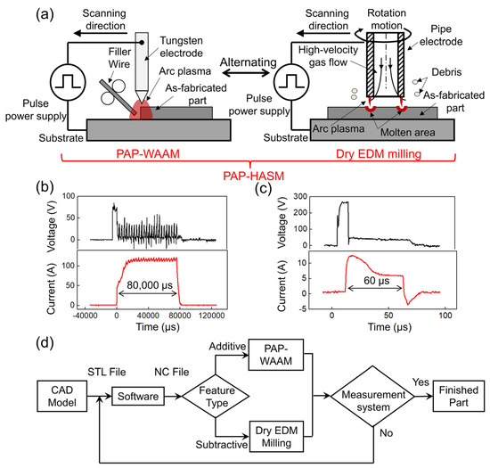 Hybrid additive and subtractive manufacturing method using pulsed arc plasma. (a) Schematic diagram; (b) measured voltage and current waveforms during PAP−WAAM; (c) measured voltage and current waveforms during dry EDM milling; (d) flow chart.