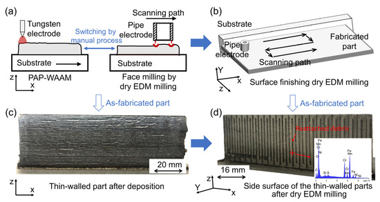 To validate the developed PAP-HASM method, it was used to fabricate a 316L SS thin-walled structure with dimensions of 110 mm × 36 mm × 2 mm. Figure 2 shows the schematic diagram of the PAP-HASM process and as-fabricated parts in this experiment. First, the PAP-WAAM is performed (Figure 2a). The PAP-WAAM process was carried out using developed additive manufacturing devices consisting of a 200 A-rated pulse power supply (HB-J6; Hong Ben Shi Ye, Shanghai, China), a three-axis motion platform, a “cold” wire feeder. The experimental parameters of the PAP-WAAM are listed in Table 1. A commercial 316L SS wire with a diameter of 1.2 mm was melted using pulsed arc plasma and deposited on a rectangular 316L SS substrate with dimensions of 150 mm × 100 mm × 8 mm. Argon was used throughout the PAP-WAAM process to prevent oxidation. The chemical composition of the 316L SS wire is listed in Table 2. The layer thickness is approximately 1 mm. The PAP-WAAM is suspended each 10 layers, and dry EDM milling is performed to mill the top surface of the as-fabricated component while precisely controlling the thickness of the 10 layers at 9 mm (Figure 2a). The PAP-WAAM and dry EDM milling processes were manually switched in this study. Dry EDM milling was carried out using a precision EDM machine (DMK7140, Hanchuan Machine Tool Works, Hanzhong, China). Compressed air was used as an assist gas. Dry EDM milling parameters are listed in Table 3. The 36 mm-height component was fabricated using four additive and subtractive manufacturing cycles (Figure 2c). After finishing the sequence of deposition and face milling, surface finishing is performed by dry EDM milling to remove other unwanted materials, such as remaining stair steps on the side surface, and to ensure a 2 mm-width of the as-fabricated component (Figure 2b). Some debris reattach on the side of the part after dry EDM milling (Figure 2d). The mechanism underlying debris reattachment is described in detail in Section 3. The actual discharge voltage and current waveform during PAP-WAAM and dry EDM milling are presented in Figure 1b,c. In addition, to evaluate the mechanical properties of the PAP-HASM specimens, a 40-layer thin-walled structure was fabricated, as a counterpart, by PAP-WAAM under the same processing conditions (Table 1).