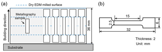 (a) The locations of the metallographic sample and tensile samples; (b) Tensile sample dimensions. Note: Both the tensile and metallurgical samples include dry EDM milled surfaces.