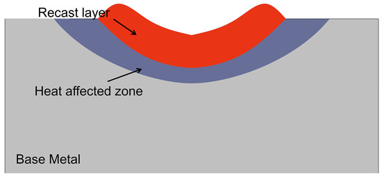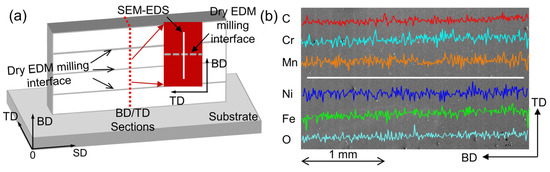 Based on our understanding of the PAP-HASM process, there is a technological challenge that needs to be considered to realize this hybrid manufacturing process. Figure 4 shows the schematic diagram of the dry EDM crater. Dry EDM milling is a thermal erosion process wherein the unwanted materials are removed by melting and evaporation [24]. However, the unremoved materials inside the molten pool are resolidified on the surface of the part to form a recast layer (Figure 4). As a result, after dry EDM, the surface layer of the part usually experiences oxidation when air is used as a flushing gas. In PAP-HASM, owing to the alternation of PAP-WAAM and Dry EDM milling, the oxidation of the part surface after dry EDM milling may have a detrimental effect on the as-fabricated component. To investigate the effect of the recast layer on the as-fabricated component, the distribution of the chemical composition along the build direction was analyzed by SEM-EDS. Figure 5a shows the location of the SEM-EDS line spectrum. The measurement location crosses the dry EDM milling interface. Figure 5b shows the results of the SEM-EDS line spectrum crossing the dry EDM milling interface. The distribution of the chemical composition crossing the dry EDM milling interface is relatively uniform, without significant variations in the carbon and oxygen content. This indicates that the dry EDM milling did not significantly affect the chemical composition of the 316L SS parts fabricated by PAP-HASM. This phenomenon may be due to the recast layer on the part surface being very thin due to the large amount of molten material removed by the assist gas [24,25]. Figure 6 shows the microstructure of 316L samples fabricated by PAP-WAAM. Some gray δ-ferrite is present in the white γ-austenite matrix. The grains grow almost along the direction of the build, which agrees with previous reports [27].