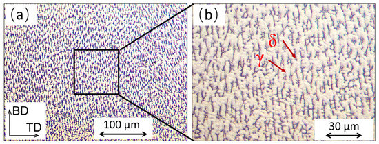 The samples required for both metallographic analyses and mechanical testing were cut off from as-built 316L SS parts using wire EDM. The locations of the metallographic and mechanical test samples are shown in Figure 3a. The metallographic specimens were first cold-mounted, ground and polished to mirror finish. Chemical composition analysis of the 316L SS part fabricated by PAP-HASM was performed by scanning electron microscopy (SEM) equipped with energy dispersive spectroscopy (EDS) (SU8000; Hitachi, Tokyo, Japan). In addition, the samples after polishing were electrochemically etched in a 10% oxalic acid solution in order to observe microstructure. The dimension of the tensile test samples is shown in Figure 3b. Tensile measurements were performed using a universal testing machine (AGXplus; Shimadzu, Kyoto, Japan) with a constant loading rate of 2 mm/min. The fracture surfaces and corresponding features of the tested samples were observed by SEM (Pharos G1; Phenom World, Eindhoven, The Netherlands). The Archimedes method was used to measure the relative density of as-fabricated specimens, where three specimens of the same type were measured to obtain an average value. The surface morphology and surface roughness of the as-fabricated parts were observed and measured using a super depth of field microscope (VHX-1000; Keyence, Osaka, Japan) and white light microscope (NewView 8200; Zygo, Middlefield, CT, USA), respectively.